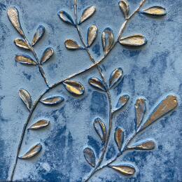 This unique and original contemporary artwork "Petites fougères dorées sur fond bleu 3" on the subject of Nature has been created by the contemporary artist Trébucq Marion .
