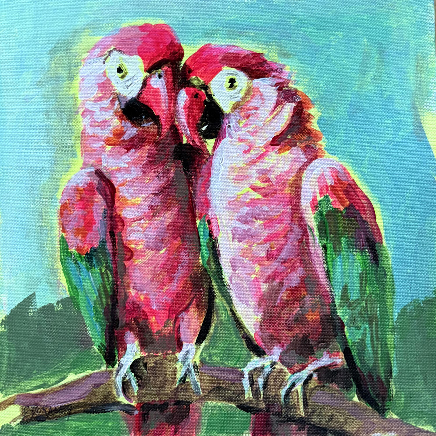 This unique and original contemporary artwork, "Les 2 perroquets" (The Two Parrots), was created by contemporary artist Morales Géraldine. The artist used acrylics to create this small-format painting on canvas in a figurative style.