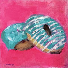 This unique and original contemporary artwork, "Green Donuts," was created by contemporary artist Morales Géraldine. The artist used acrylics to create this small-format painting on paper in a figurative style.