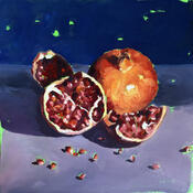 This unique and original contemporary artwork, "Majestic Pomegranates," was created by contemporary artist Morales Géraldine. The artist used oil paint to create this small-format painting on paper in a figurative style.