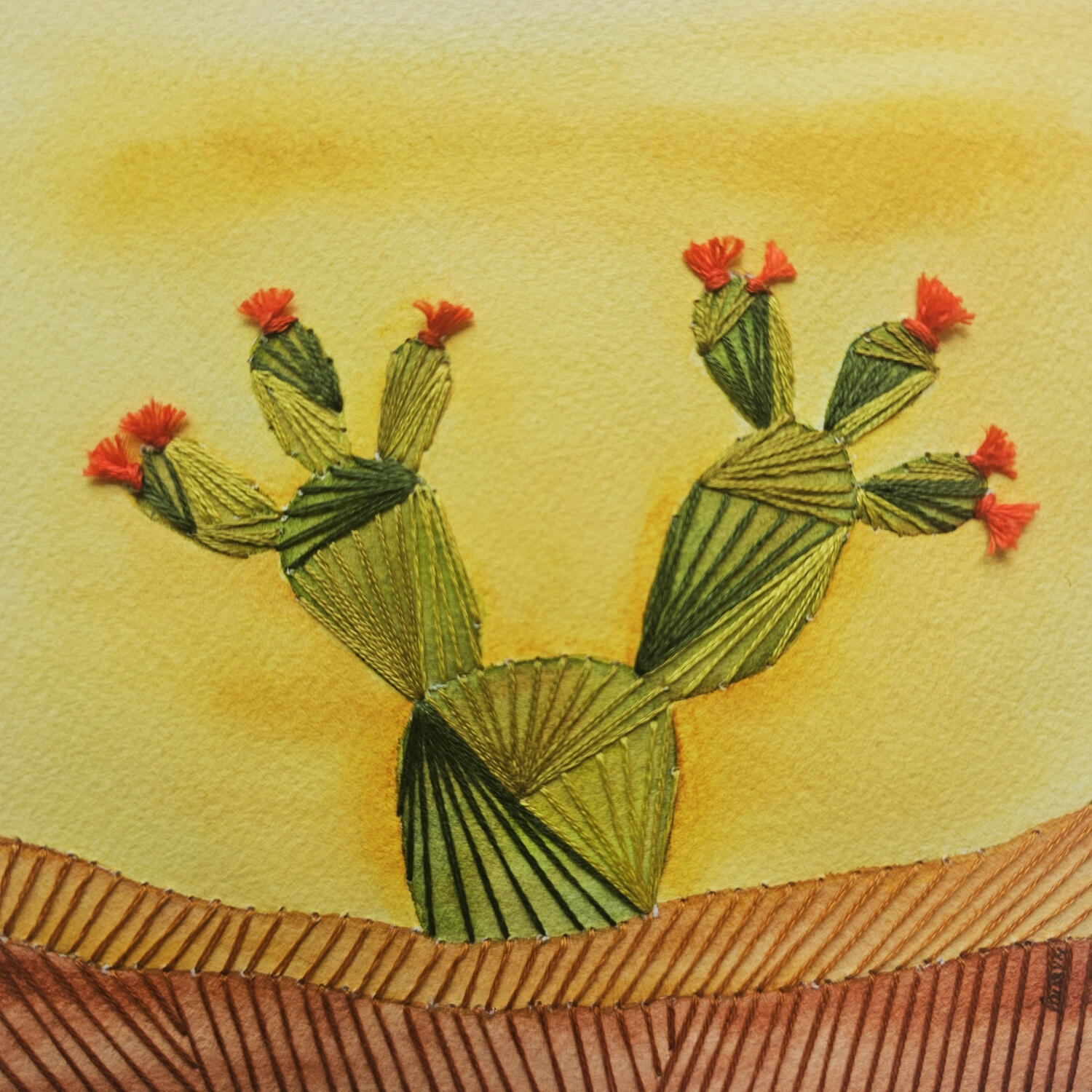 The artist used embroidery and watercolor media on cotton paper to create this subject matter, small size painting.