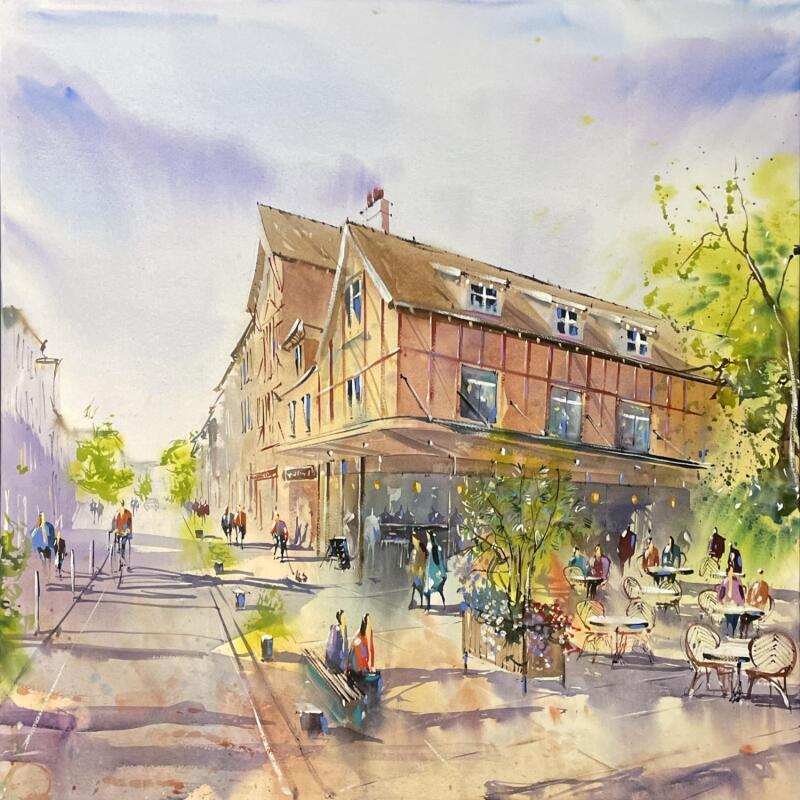 This unique and original contemporary artwork "Place de café à Troyes" on the subjects of Architecture, Urban has been created by the contemporary artist Bailly Kévin .