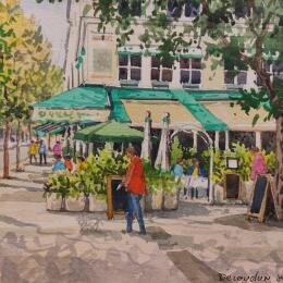 This unique and original contemporary artwork "Café au pont Louis Philippe" on the subject of Urban has been created by the contemporary artist Decoudun Jean charles.