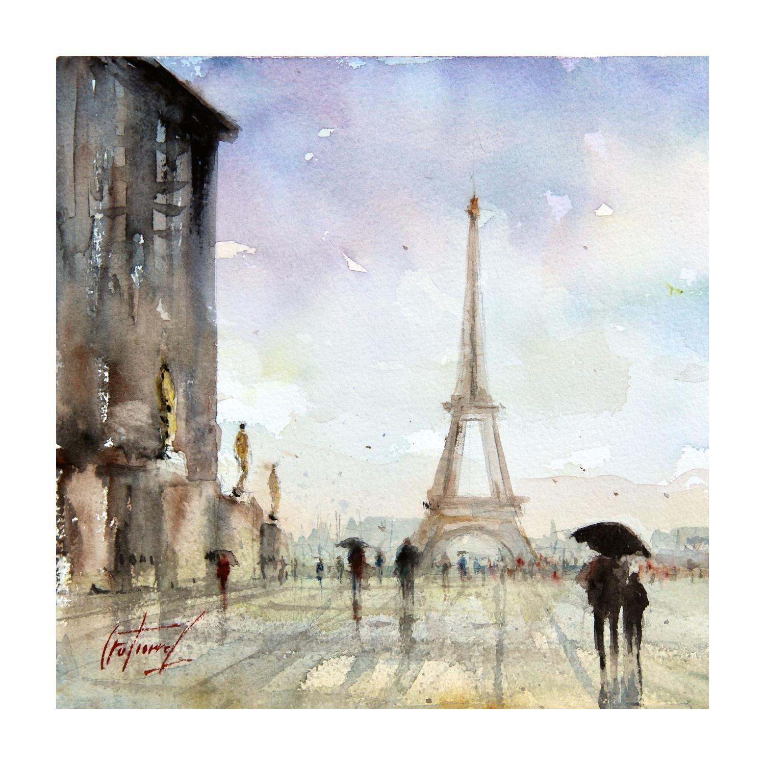 Pluie sur le TrocadéroPainting Pluie sur le Trocadéro by Gutierrez | Painting Figurative Urban Watercolor