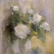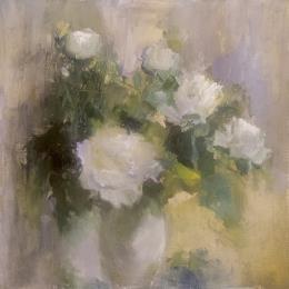 This oil painting captures the softness and timeless elegance of a bouquet of white roses. The flowers, delicately highlighted by luminous touches, seem to emerge from a subtle blur that surrounds the composition. Shades of leafy green blend harmoniously with pastel tones of beige, yellow and light violet, creating a peaceful, romantic ambience. The vase is barely suggested, allowing the flowers to take center stage. The delicate texture and fluid brushstrokes create a feeling of lightness, evoking the ephemeral beauty of nature.