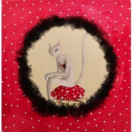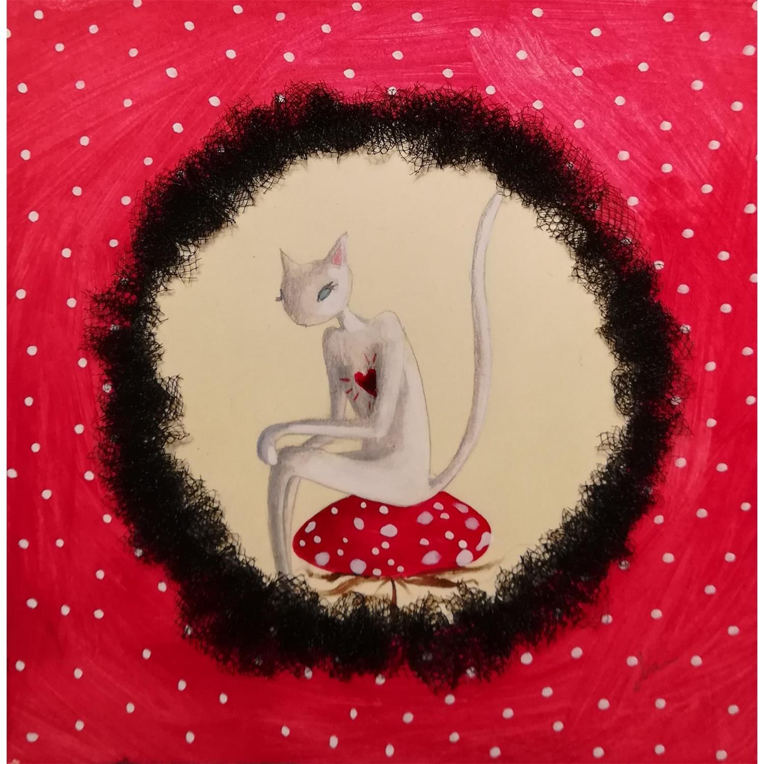 This unique and original contemporary artwork "Il gatto che si emozionava troppo e il fungo" on the subject of Life style has been created by the contemporary artist Nai.