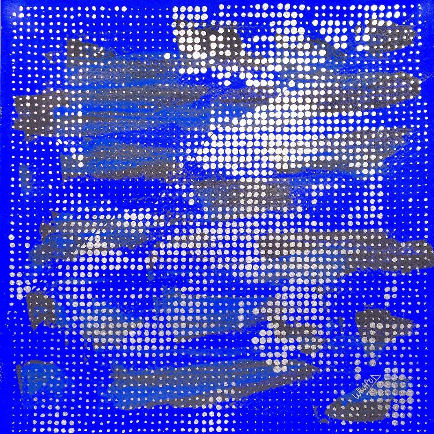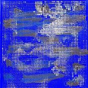 The artist has drawn his portrait here by accumulating hundreds of points. The artist first worked the background by finding a balance between black and blue klein to then add these dots of silver colors mirror. At a glance this painting reflects the light as a mirror could do, which creates a strong contrast with this dark and deep background.