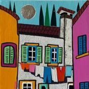 Painting Mas provençal by Lovisa | Painting Pop-art Urban Acrylic Gluing Posca Textile Silver leaf Upcycling Paper