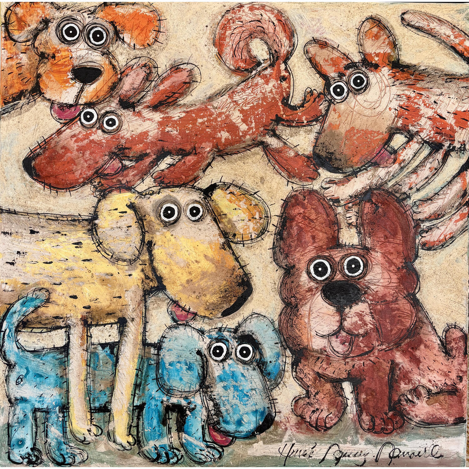 This unique and original contemporary artwork "Buddies in the square!" on the subject of Animals has been created by the contemporary artist Maury Hervé.
