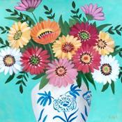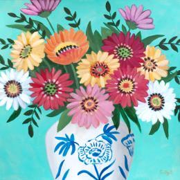 This unique and original contemporary artwork "Bouquet of flowers in a chinoiserie vase with turquoise background" was created by contemporary artist Sally B.