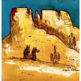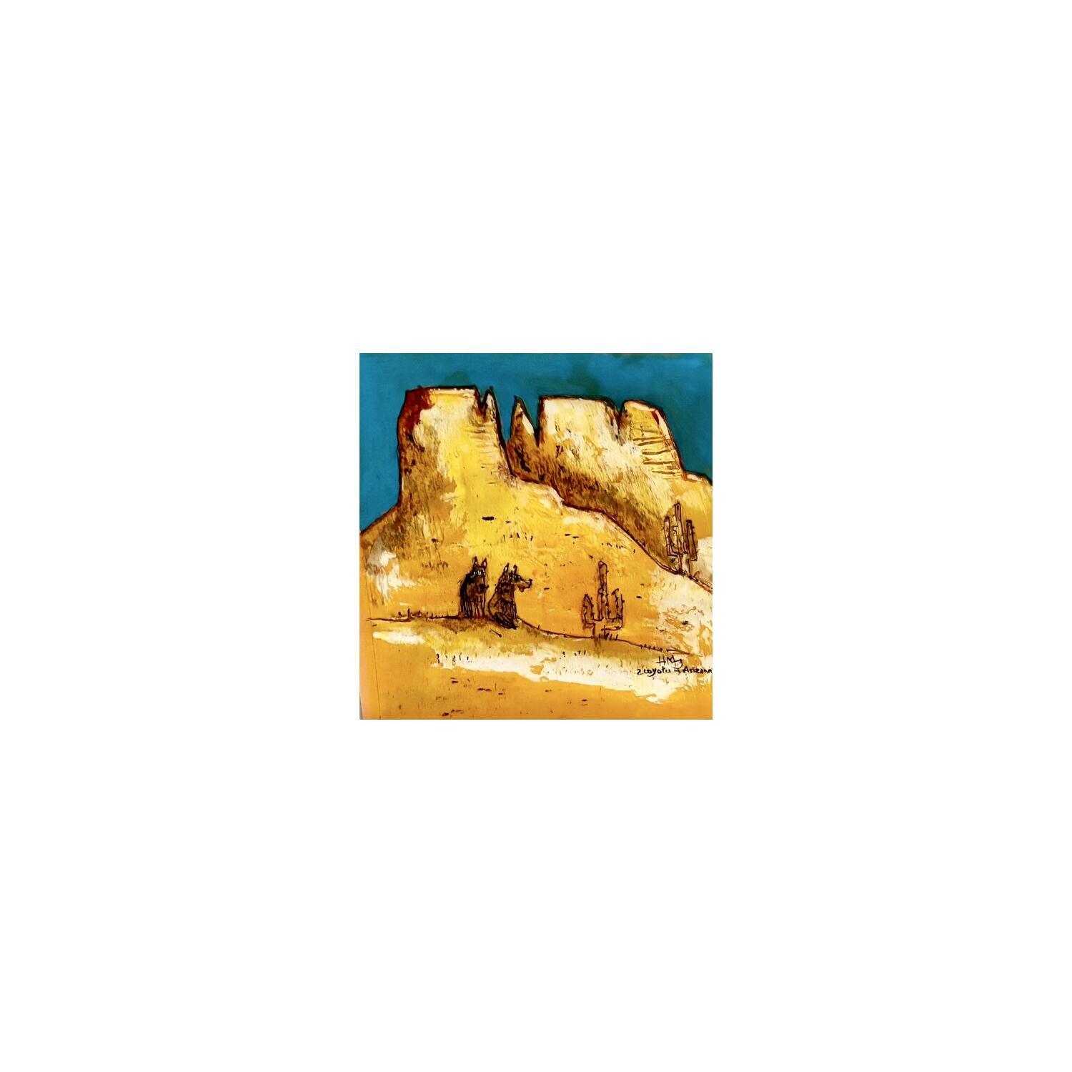 This unique and original contemporary artwork "Coyotes in Golden Canyons" on the subject of Animals has been created by the contemporary artist Maury Hervé.
