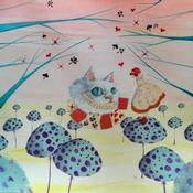 This unique and original contemporary artwork "Alice e lo Stregatto scoprono gusti in comune" on the subjects of Animals, Pop icons, Nature has been created by the contemporary artist Nai.