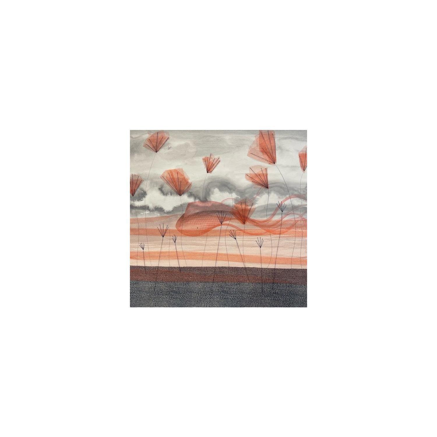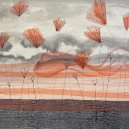 The artist used Watercolor, Textile media on Paper to create this Surrealism, Small size painting.