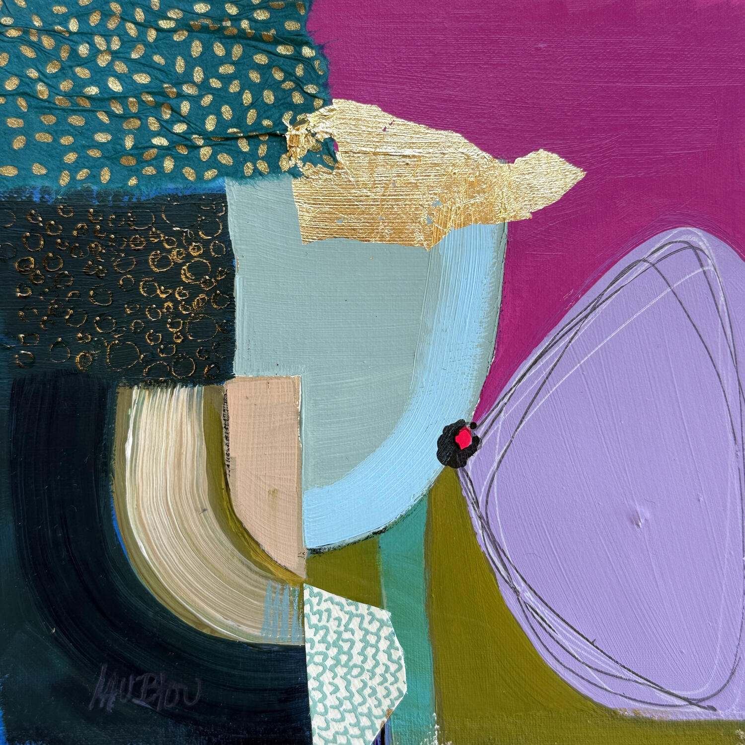 El artista utilizó las técnicas Acrílico, Cartón, Collage, Hoja de oro, Pastel para crear esta pintura Pequeño formato sobre Lienzo de estilo Abstracto sobre el tema Minimalista.