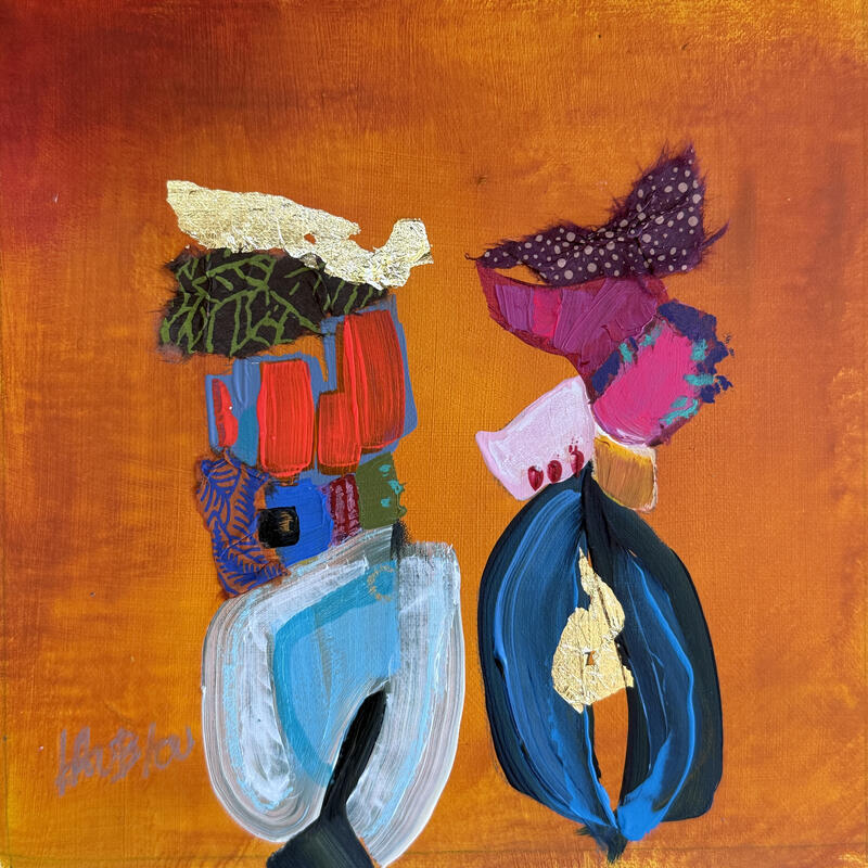 El artista utilizó las técnicas Acrílico, Cartón, Collage, Hoja de oro, Pastel para crear esta pintura Pequeño formato sobre Lienzo de estilo Abstracto sobre el tema Retrato.