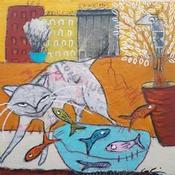 El artista utilizó las técnicas Acrílico, Collage, Pastel para crear esta pintura Pequeño formato sobre Tablero de lienzo de estilo Arte bruto sobre el tema Animales.