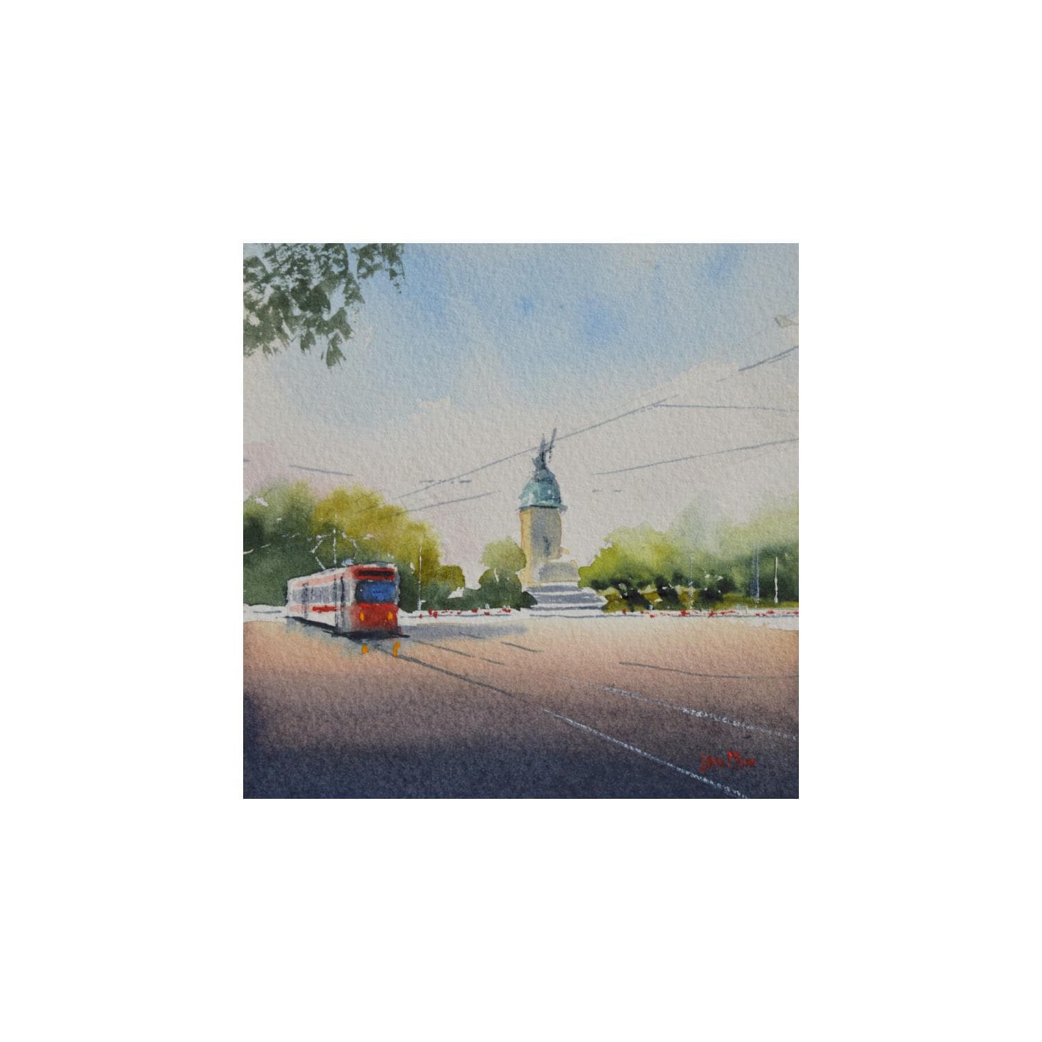Esta obra de arte contemporáneo única y original "Red tram" fue realizada por el artista contemporáneo Min Jan. El artista utilizó la técnica Acuarela para crear esta pintura Pequeño formato de estilo Figurativo sobre el tema Urbano.