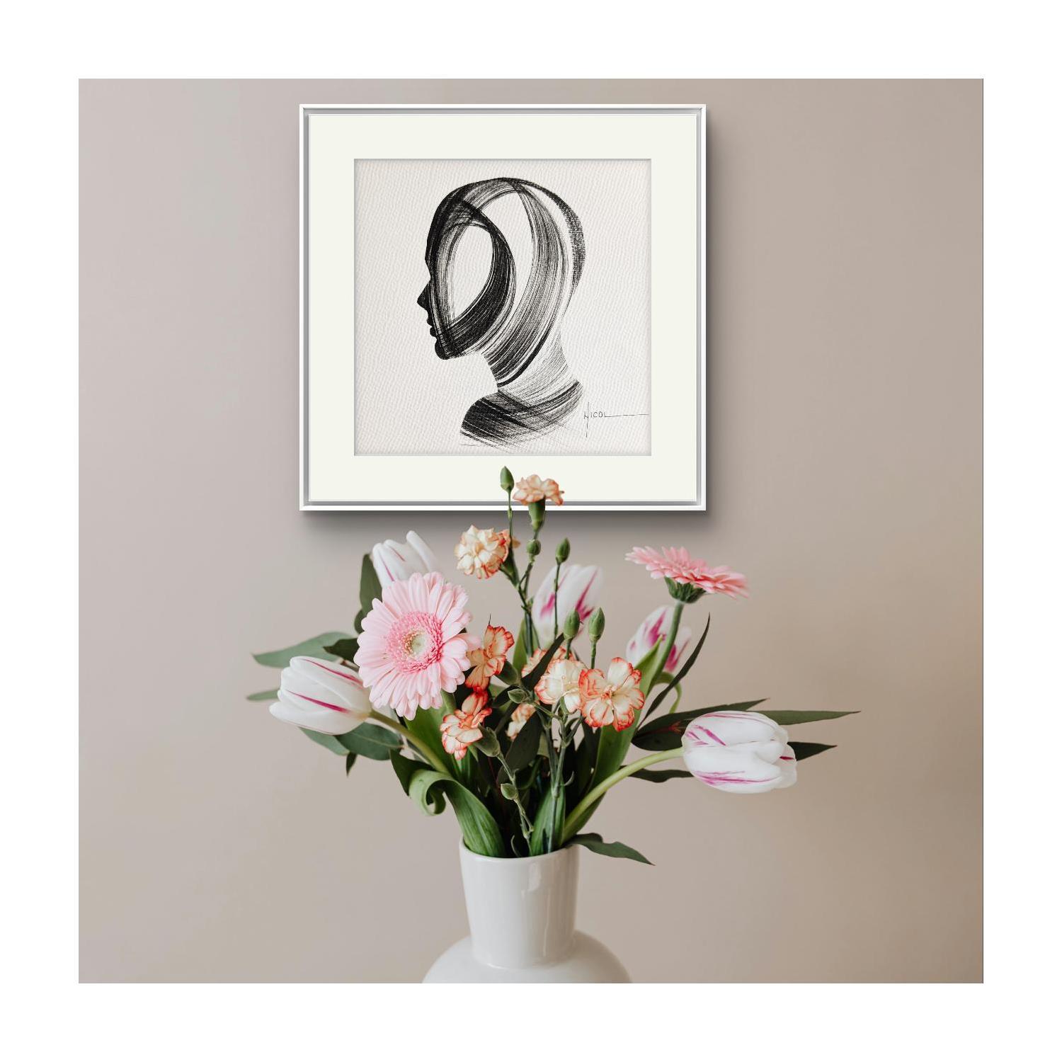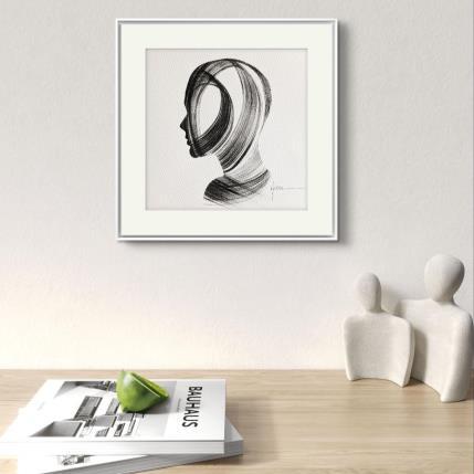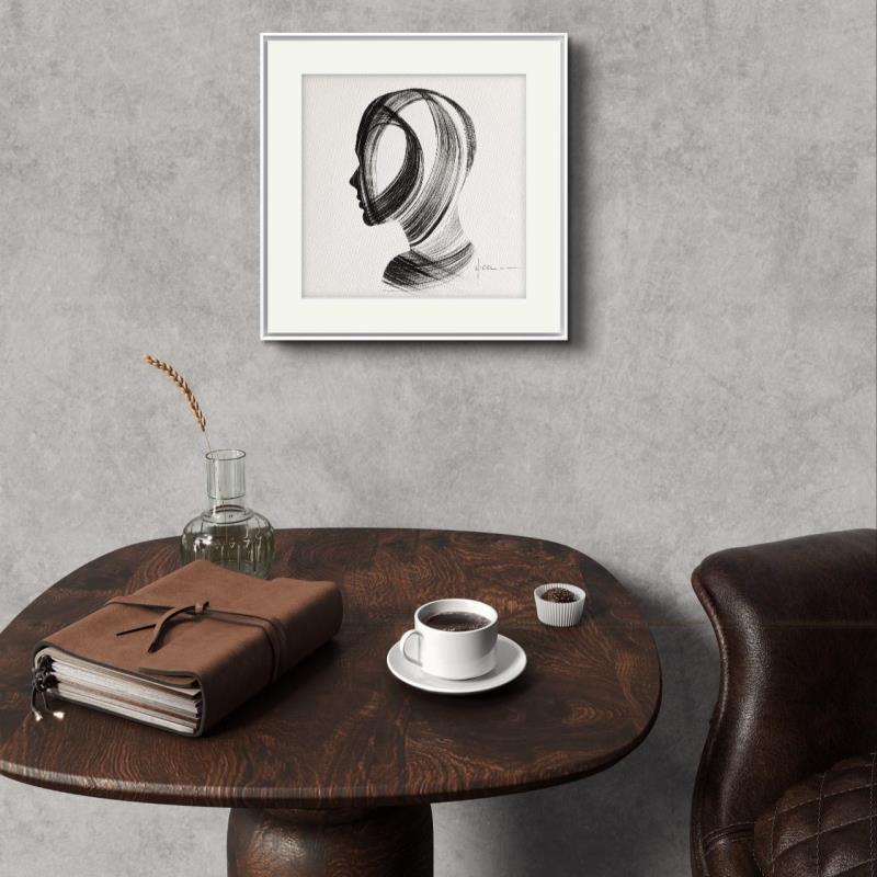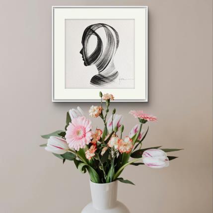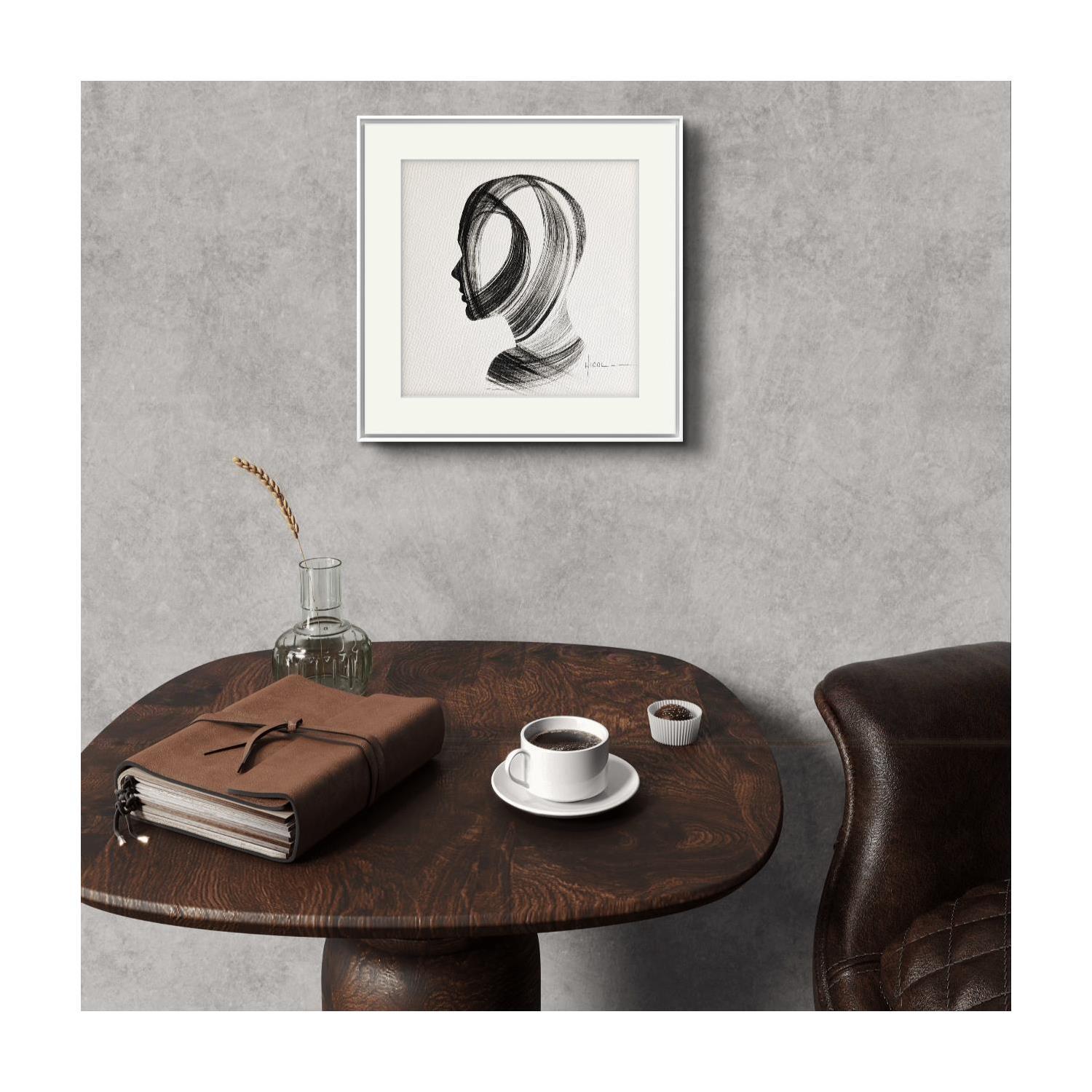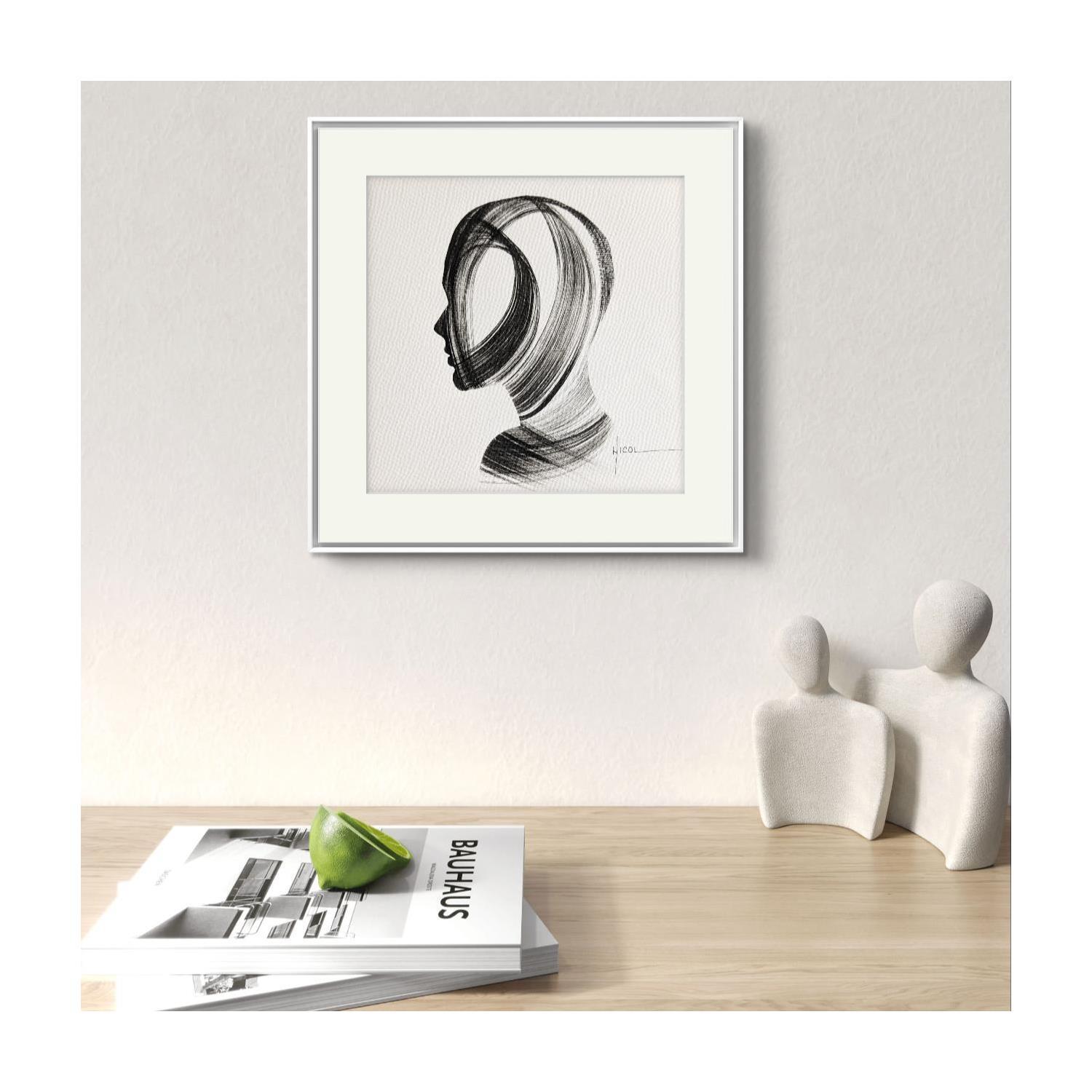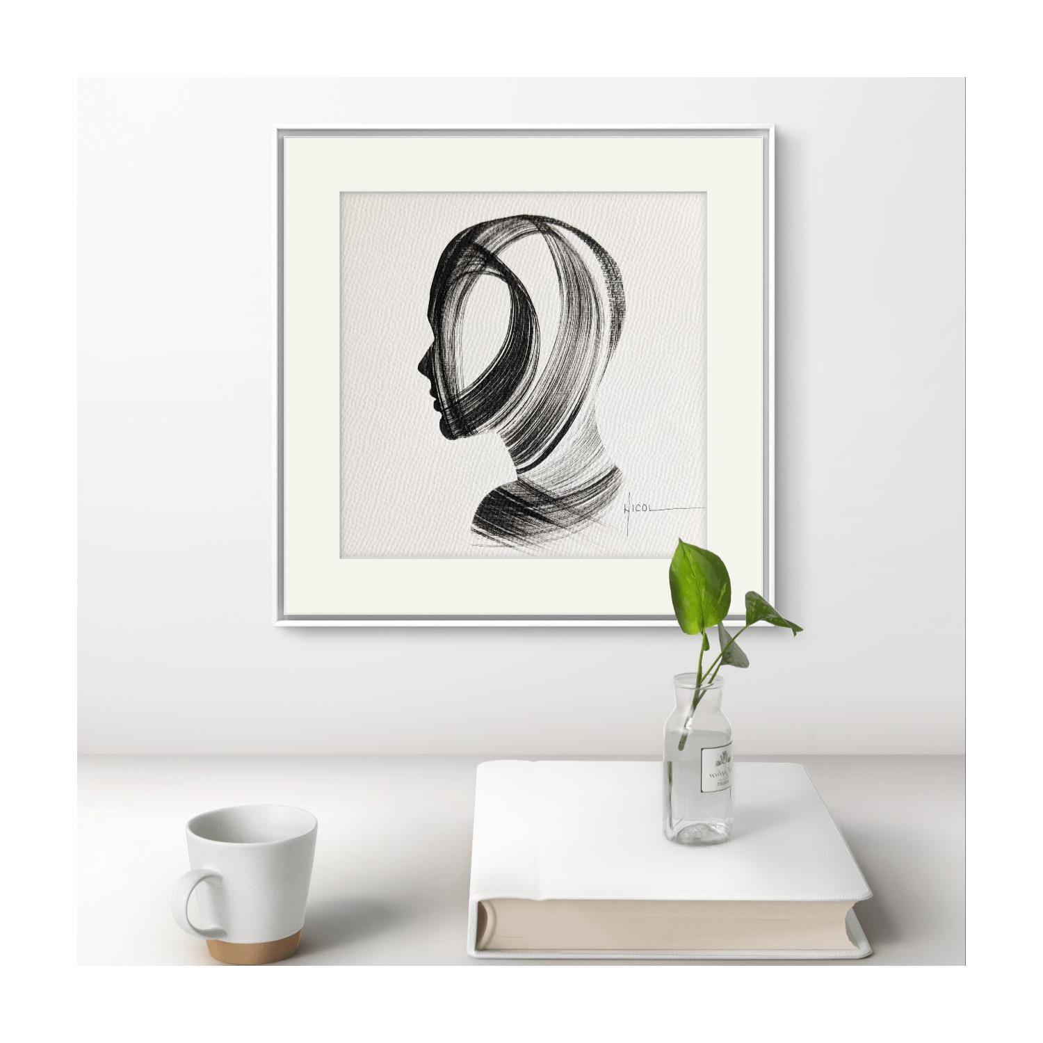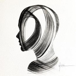 El artista utilizó las técnicas Ink, Papel para crear esta pintura Pequeño formato sobre Papel de estilo Figurativo sobre los temas Minimalista, Blanco y negro, Retrato.