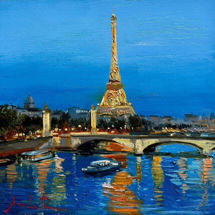 Esta obra de arte contemporánea única y original, titulada «F3 "Blue Hour in Paris" 107-21551-20251016-13», sobre los temas de la arquitectura y el cine, ha sido creada por el artista contemporáneo Xanlar. El artista utilizó óleo sobre lienzo para crear esta pintura impresionista de pequeño tamaño.