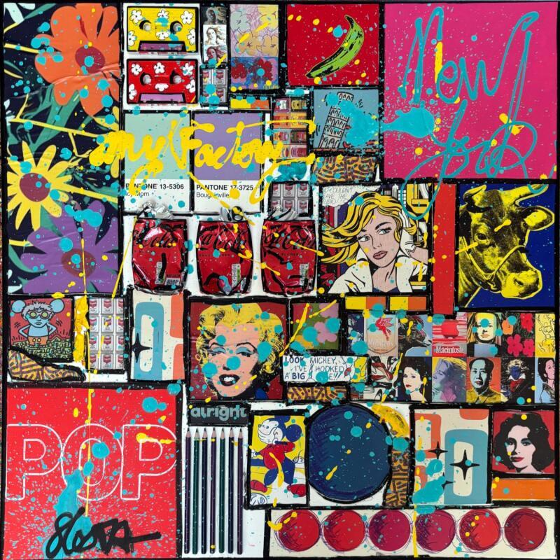El artista utilizó las técnicas Acrílico, Collage, Supraciclaje para crear esta pintura Large formato sobre Lienzo de estilo Pop art sobre el tema Iconos pop.