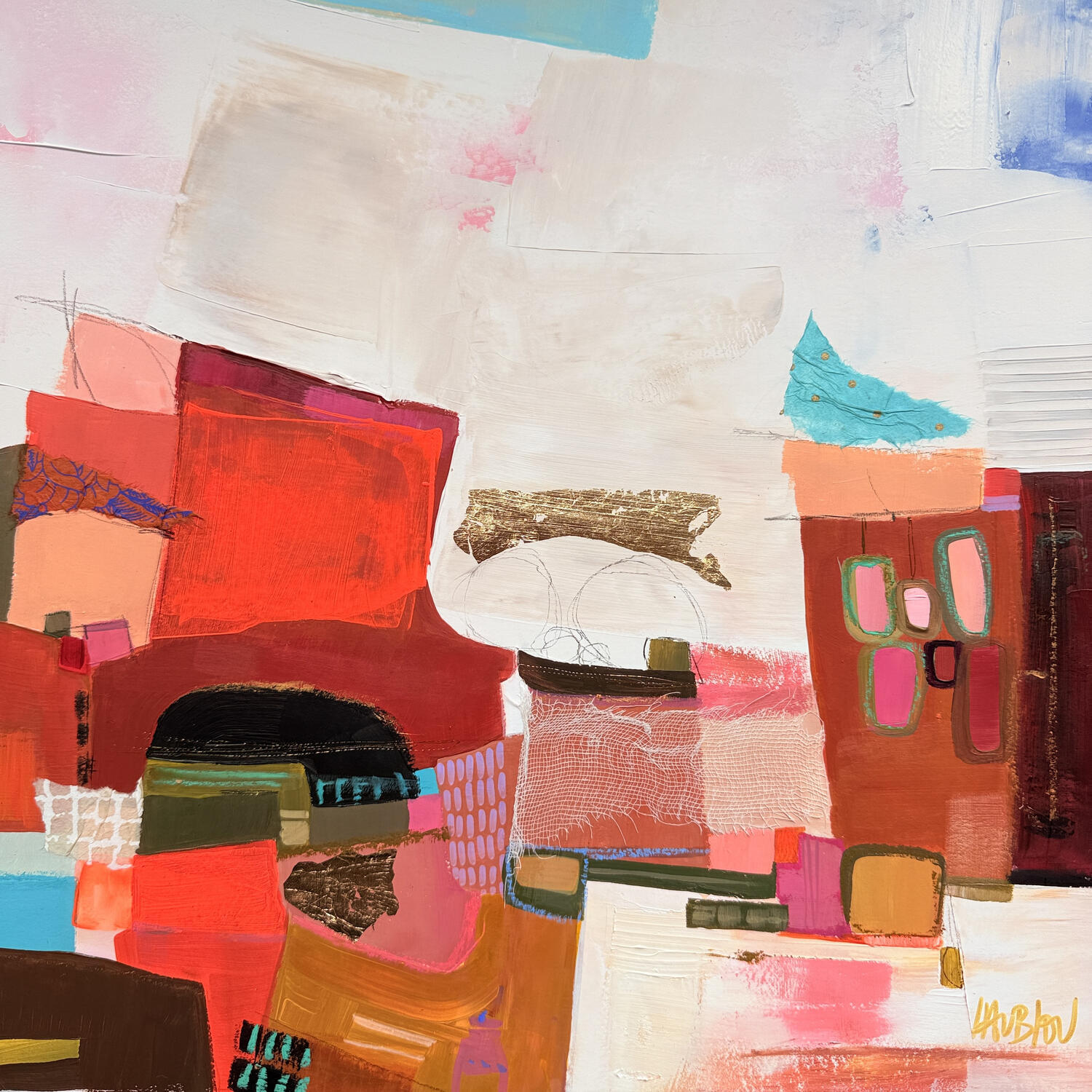 El artista utilizó las técnicas Acrílico, Cartón, Collage, Hoja de oro, Pastel para crear esta pintura Pequeño formato sobre Cartón de estilo Abstracto.