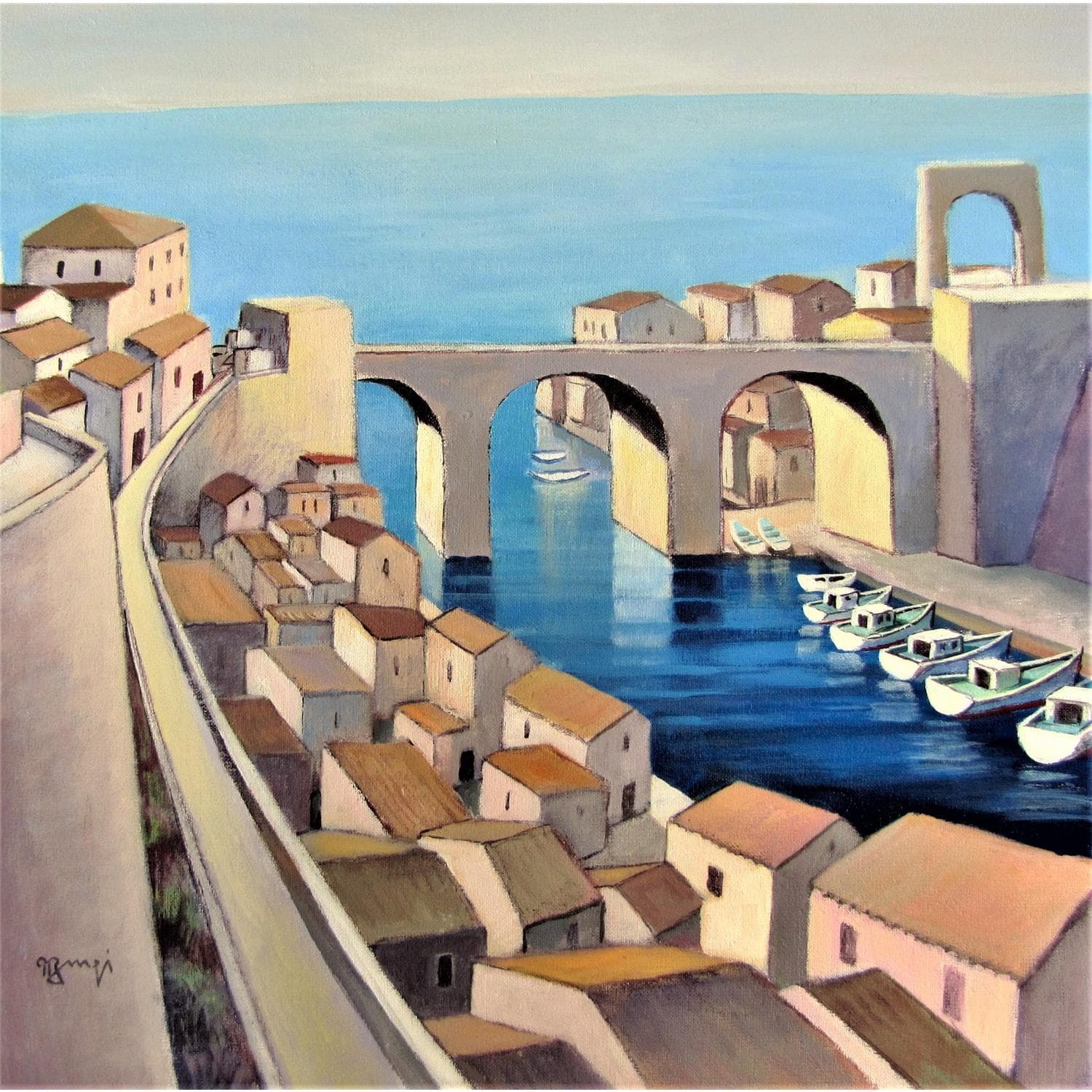 El artista utilizó la técnica Acrílico para crear esta pintura Large formato sobre Lienzo de estilo Figurativo sobre los temas Marine, Urbano, Paisajes.