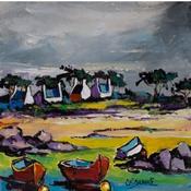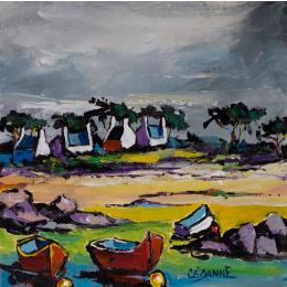 Esta obra de arte contemporáneo única y original "Ciel gris et barques rouges " fue realizada por el artista contemporáneo Cédanne.