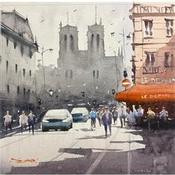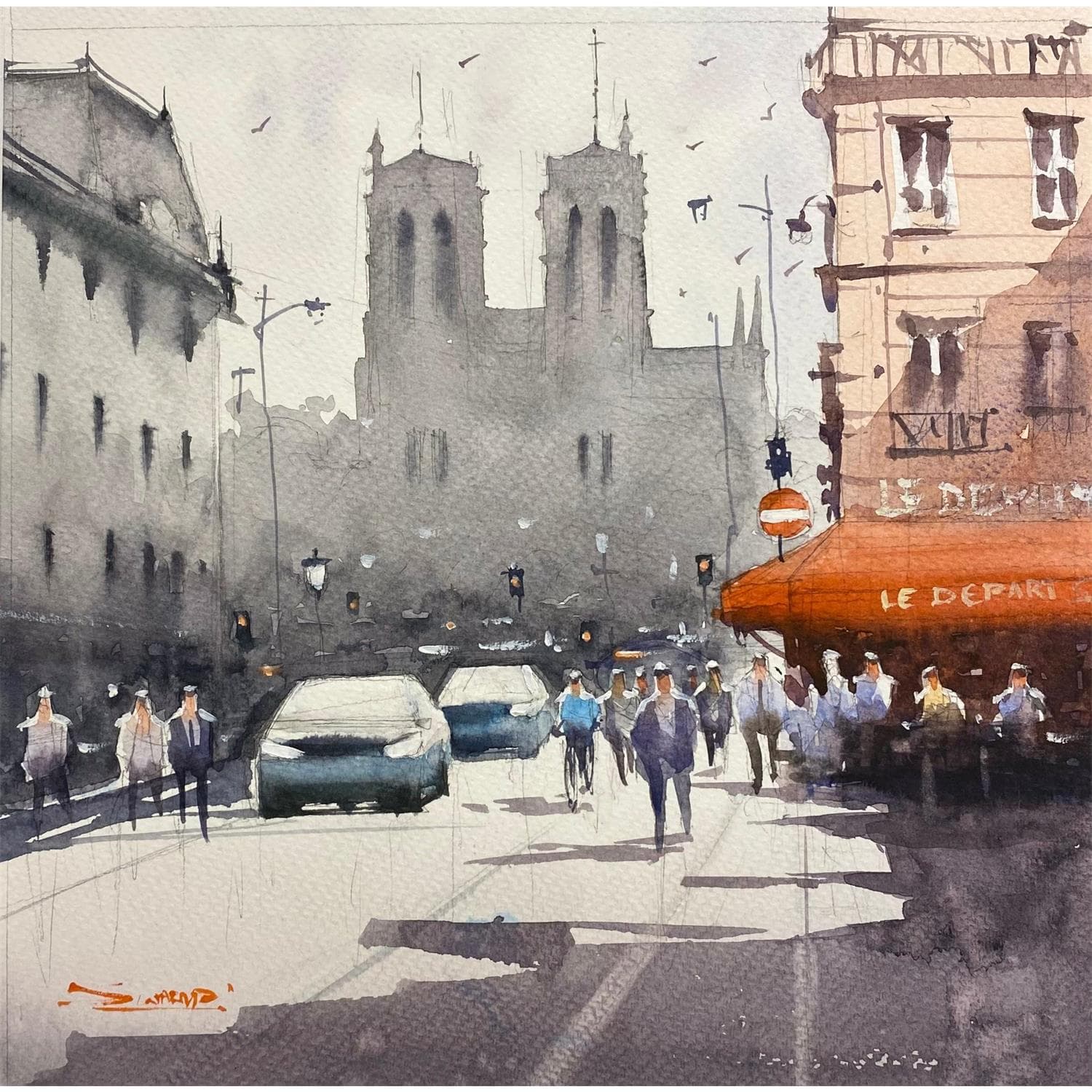 El artista utilizó la técnica Acuarela para crear esta pintura Pequeño formato sobre Papel de estilo Figurativo sobre los temas Life style, Urbano, Paisajes.