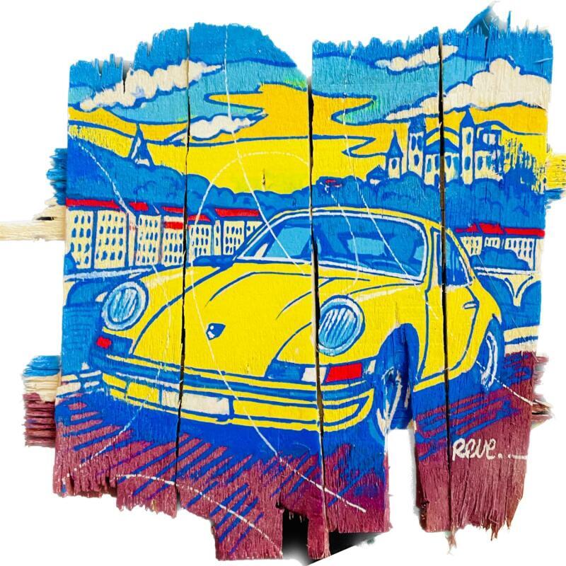 Esta obra de arte contemporáneo única y original "Porsche III" fue realizada por el artista contemporáneo Revel. El artista utilizó la técnica Acrílico para crear esta pintura Pequeño formato sobre Madera de estilo Pop art sobre el tema Iconos pop.