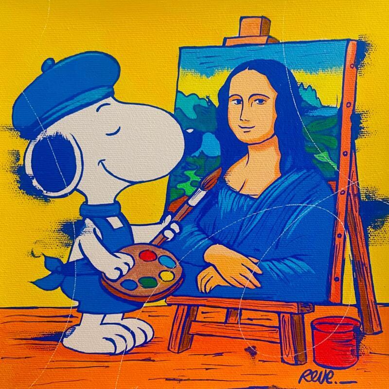 Esta obra de arte contemporáneo única y original "Monalisa x snoopy" fue realizada por el artista contemporáneo Revel. El artista utilizó diferentes técnicas para crear esta pintura Pequeño formato de estilo Pop art sobre el tema Iconos pop.