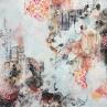 L'artiste a utilisé les techniques mixtes: collages, textures, tissus, pastels et la peinture acrylique, pour créer cette peinture petit format sur toile souple de style abstrait, surréaliste.