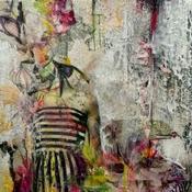 L'artiste a utilisé les techniques mixtes: collages, textures, tissus, pastels et la peinture acrylique, pour créer cette peinture petit format sur toile souple de style abstrait, surréaliste.