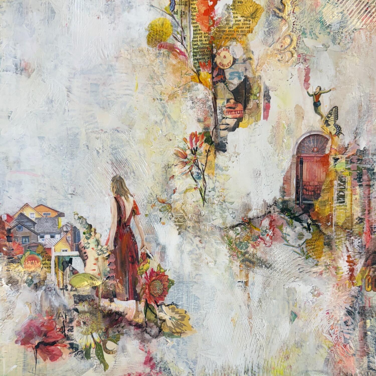 L'artiste a utilisé les techniques mixte et la peinture acrylique: Collages, textures, papiers, pastels et autre médiums pour créer cette peinture petit format sur toile de style semi-abstrait.