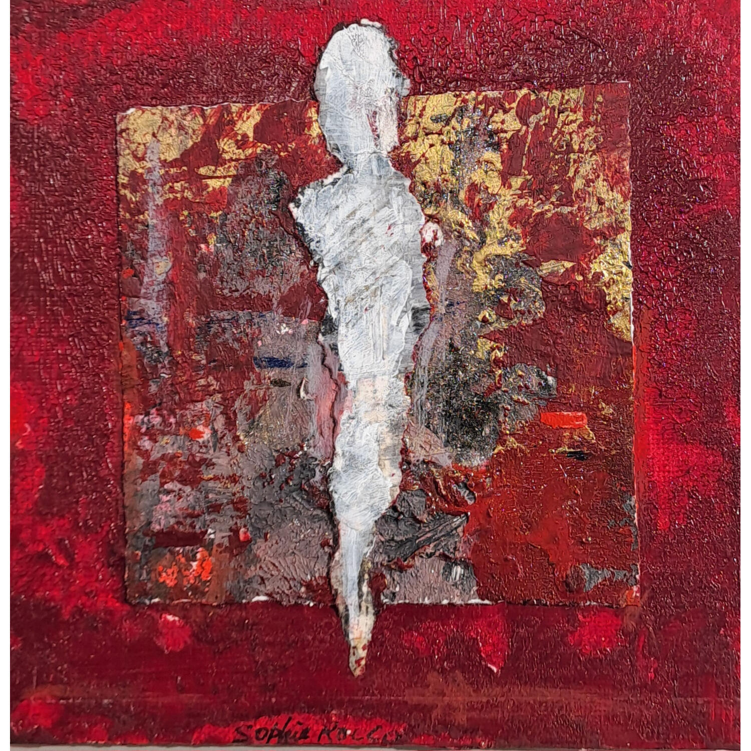 L'artiste a utilisé les techniques Acrylique, Collage, Sable pour créer cette peinture petit format sur Carton toilé de style Art Singulier.