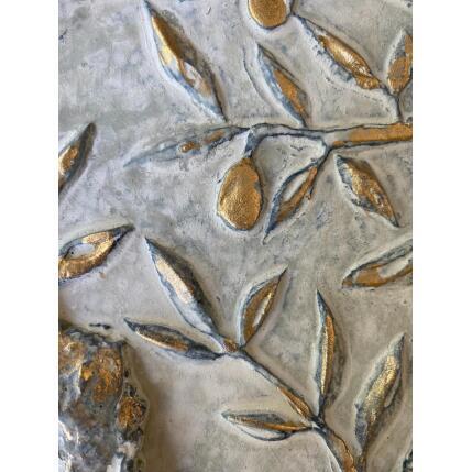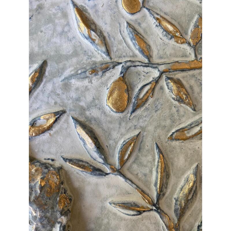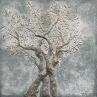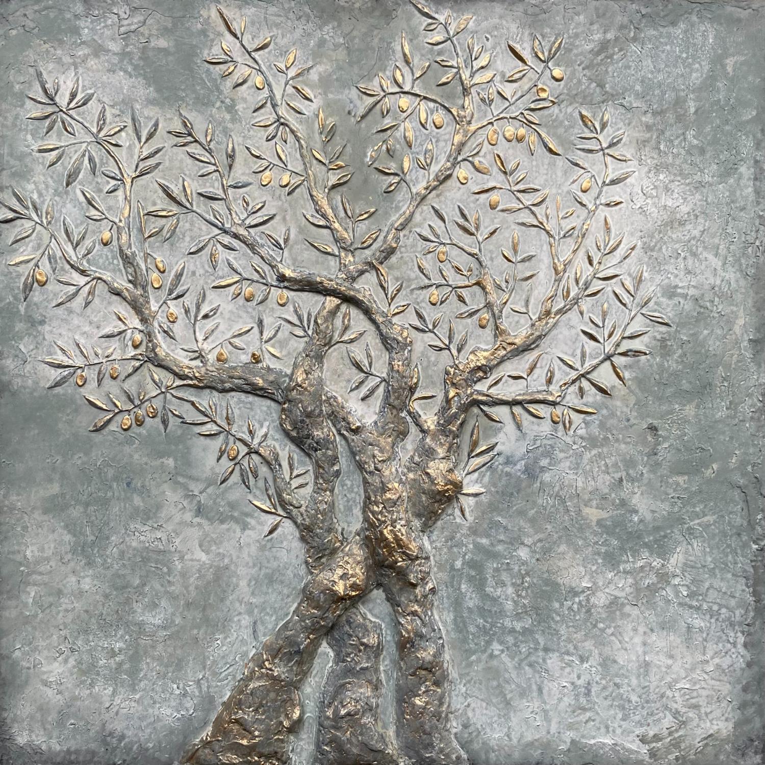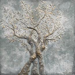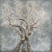 Cette oeuvre d'art contemporain unique et originale "Olivier à trois troncs entrelacés sur fond vert de gris" a été réalisée par l'artiste contemporain Trébucq Marion .