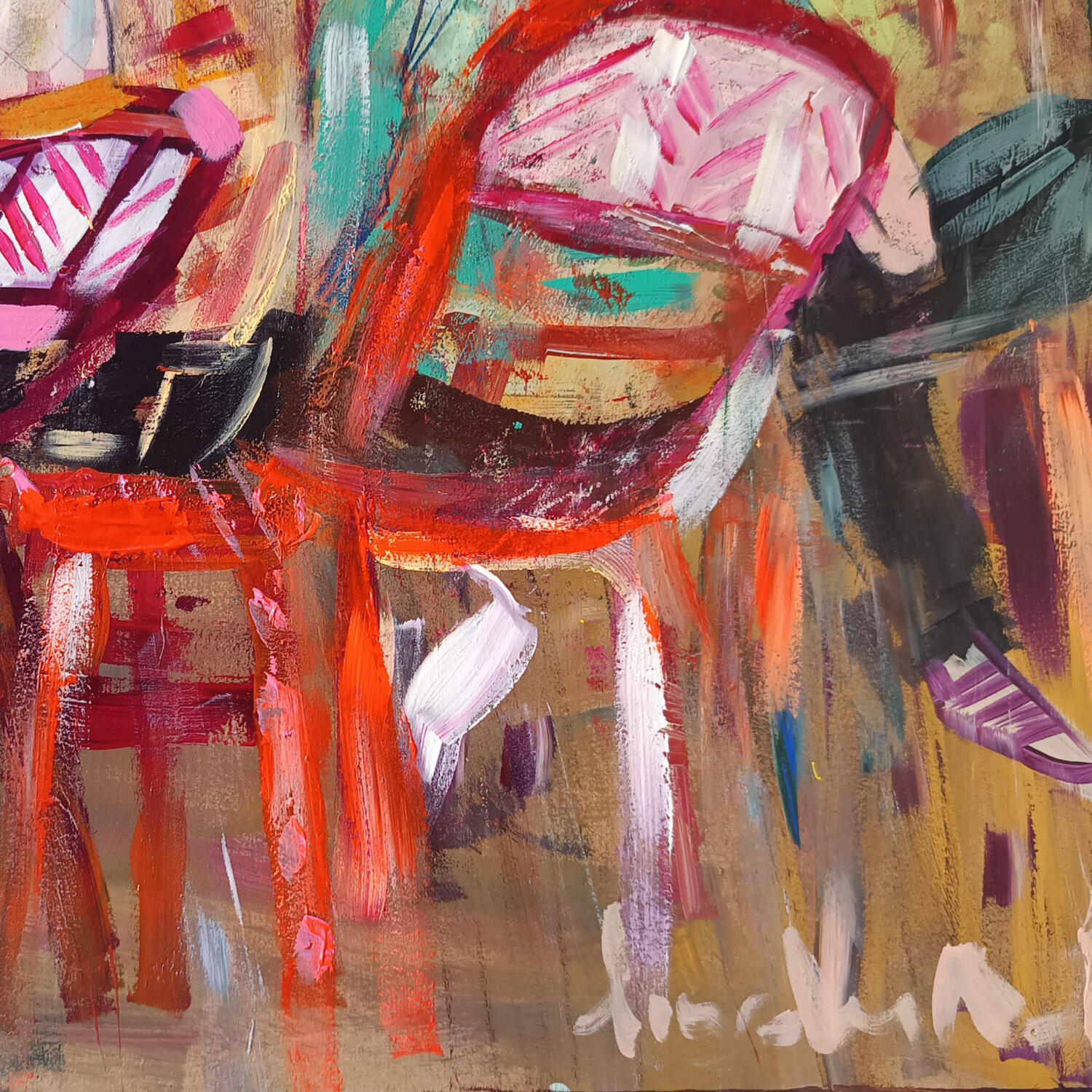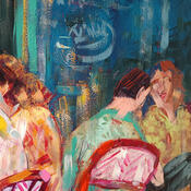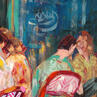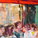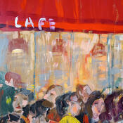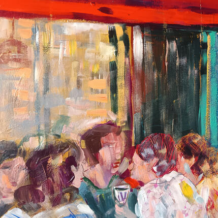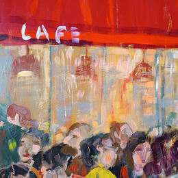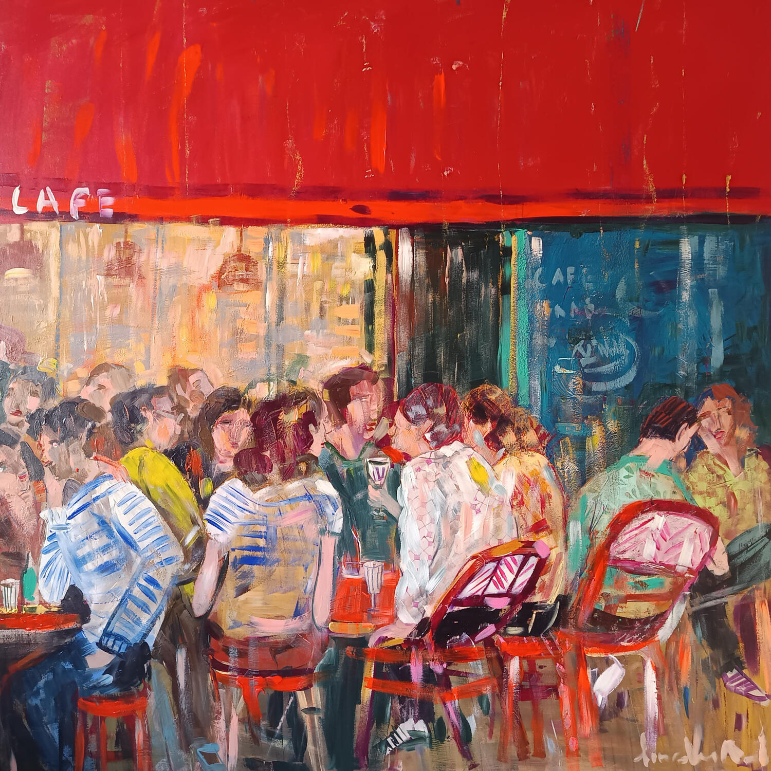 Un café un après-midi de juin. Il y a beaucoup de lumière, un grand auvent rouge qui protège du soleil et des chaises de bistrot occupées. Les gens parlent, rient et profitent du moment. Il y a plusieurs conversations en même temps. C’est une scène joyeuse et vivante, où l’été commence et où le temps paraît léger. Beaucoup de gens à l'intérieur et à l'extérieur du café.