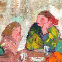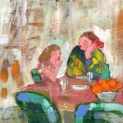 Scène intime dans la cuisine : une mère et sa fille discutent. Devant elles, un bol d’oranges dont le parfum embaume la pièce. La lumière tamisée et l’ambiance simple renforcent cette impression de tranquillité et de complicité familiale.