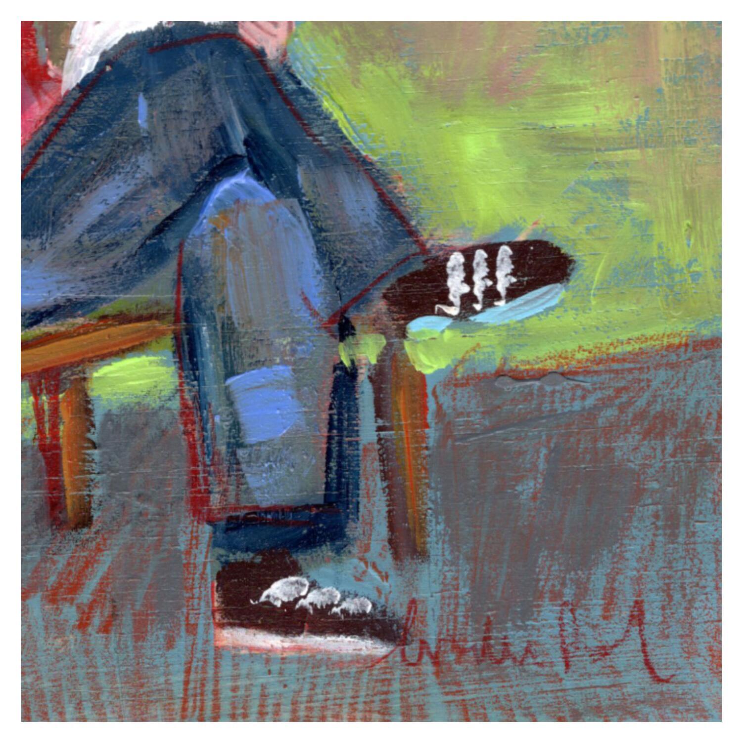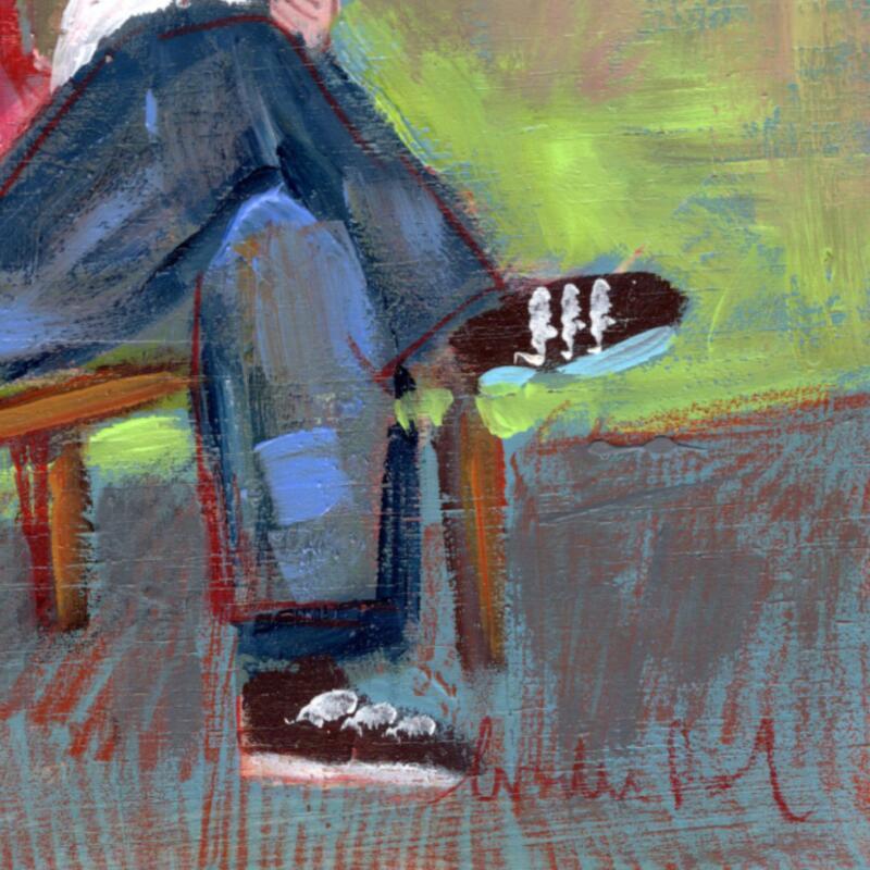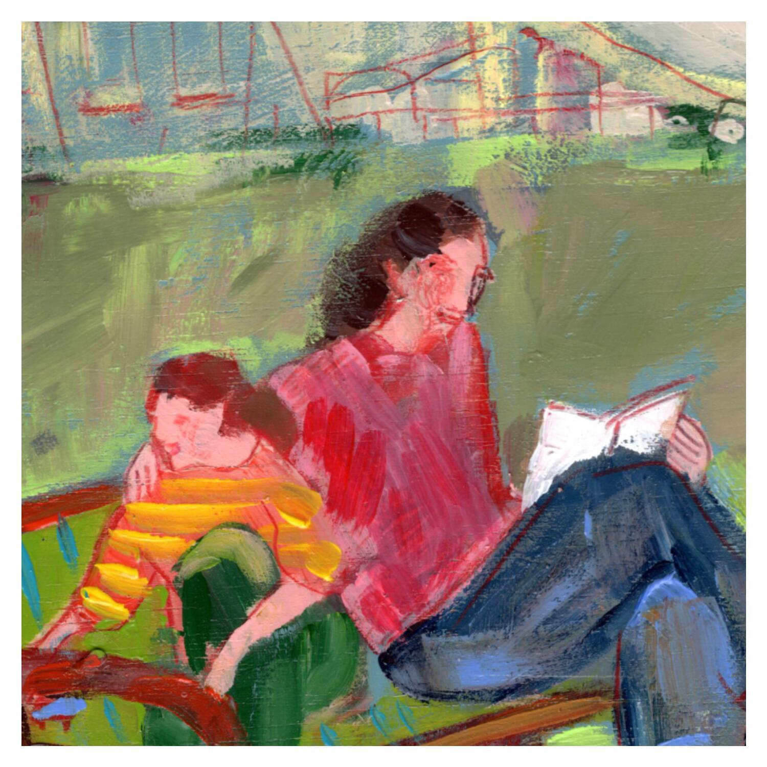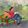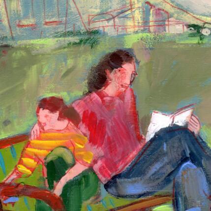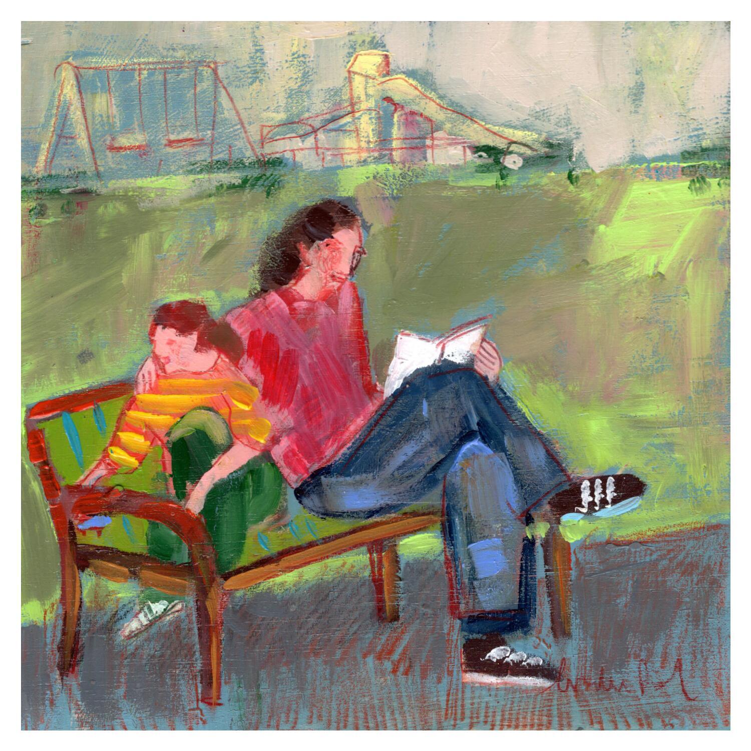 Dans le parc, après l'école. Une scène comme tant d'autres dans un jardin urbain : les balançoires sont encore vides, les enfants sont sur le point d'arriver. La petite fille joue sur le banc, tandis que sa mère est absorbée par sa lecture.