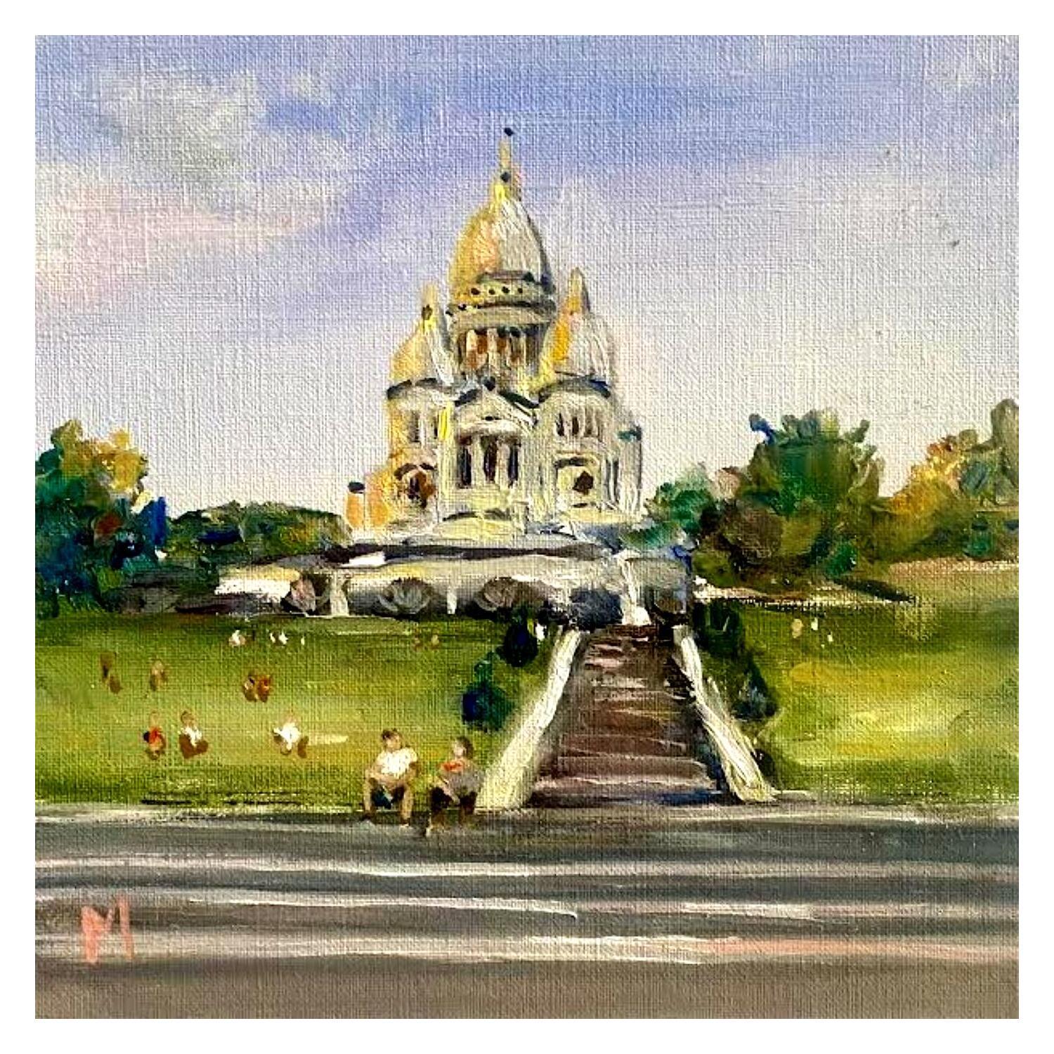 L'artiste a utilisé la peinture à l'huile pour créer cette peinture petit format au style singulier. Le sujet véritable de cette toile se trouve sur les marches, un couple dont les postures trahissent une jolie complicité.