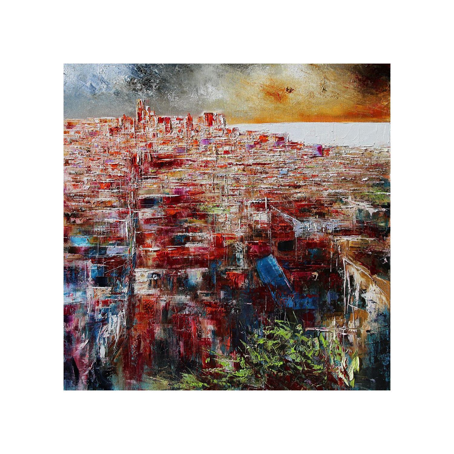 L'artiste a utilisé la technique Huile pour créer cette peinture grand format sur Toile de style Figuratif sur le thème Urbain.