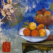 L'artiste a utilisé les techniques Pastel, Feuille d'or, Papier, Acrylique, Collage, Posca pour créer cette peinture petit format sur Carton toilé de style Figuratif sur le thème Natures mortes.