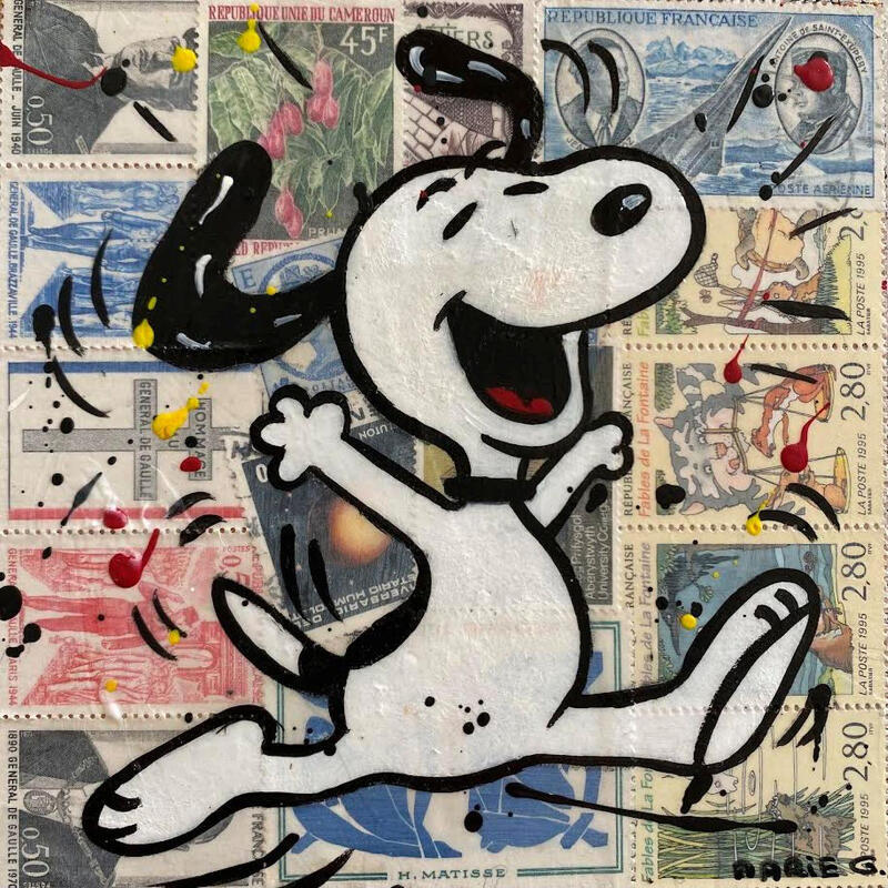 L'artiste a utilisé les techniques Collage de timbres, Acrylique pour créer cette peinture petit format sur Bois de style Pop-art sur le thème Icones Pop.