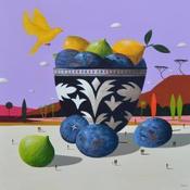 Cette oeuvre d'art contemporain unique et originale "Coupe de fruits et canari" a été réalisée par l'artiste contemporain Lionnet Pascal.