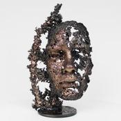 Cette sculpture représente un visage. Elle est réalisée en dentelle de métal acier et bronze.