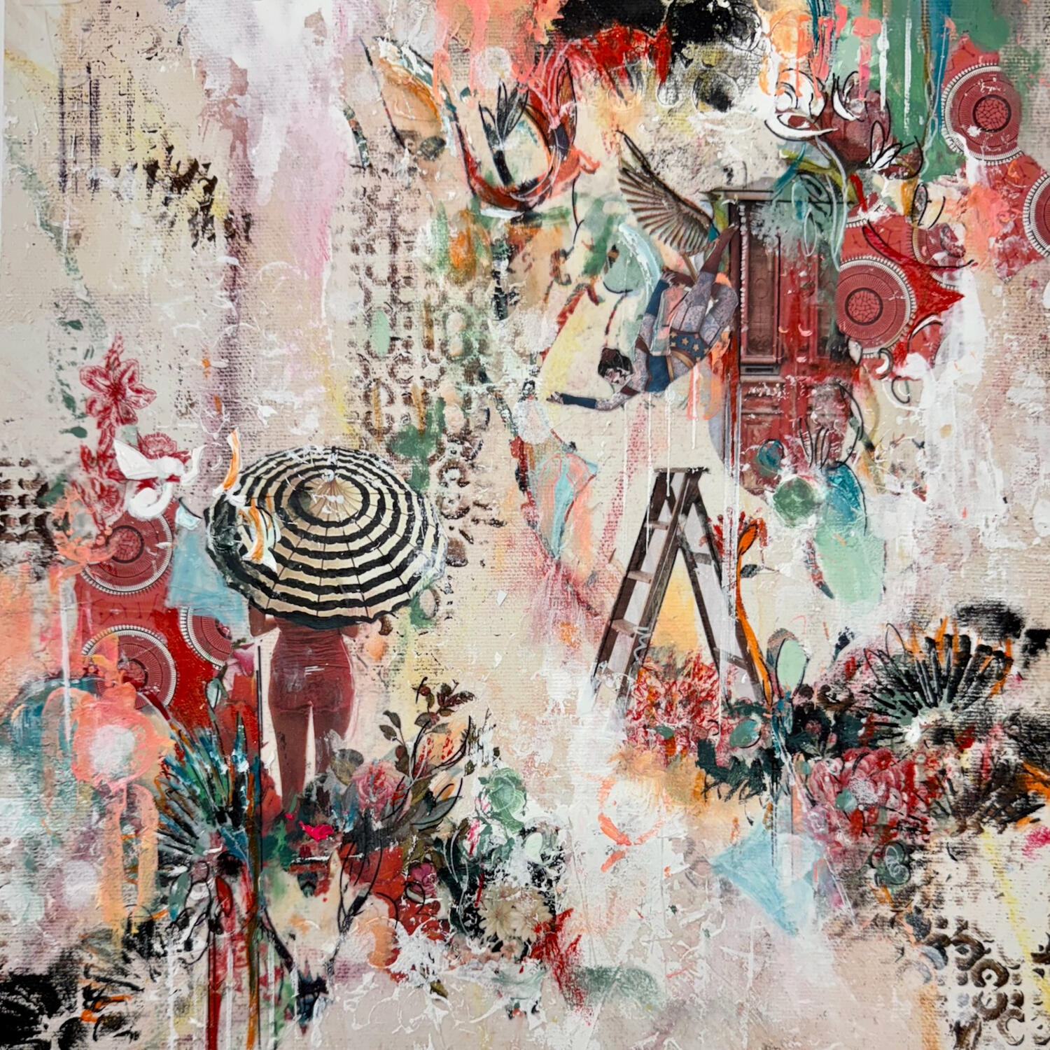 L'artiste a utilisé les techniques mixtes: peinture acrylique, textures, papiers, collage, et autres médiums afin de créer cette peinture grand format sur canevas de style semi-abstrait surréaliste.