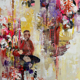 L'artiste a utilisé les techniques mixtes: peinture acrylique, textures, papiers, collage, et autres médiums afin de créer cette peinture grand format sur canevas de style semi-abstrait surréaliste.