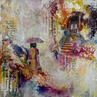 L'artiste a utilisé les techniques mixtes: peinture acrylique, textures, papiers, collage, et autres médiums afin de créer cette peinture grand format sur canevas de style semi-abstrait surréaliste.