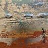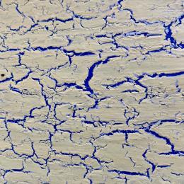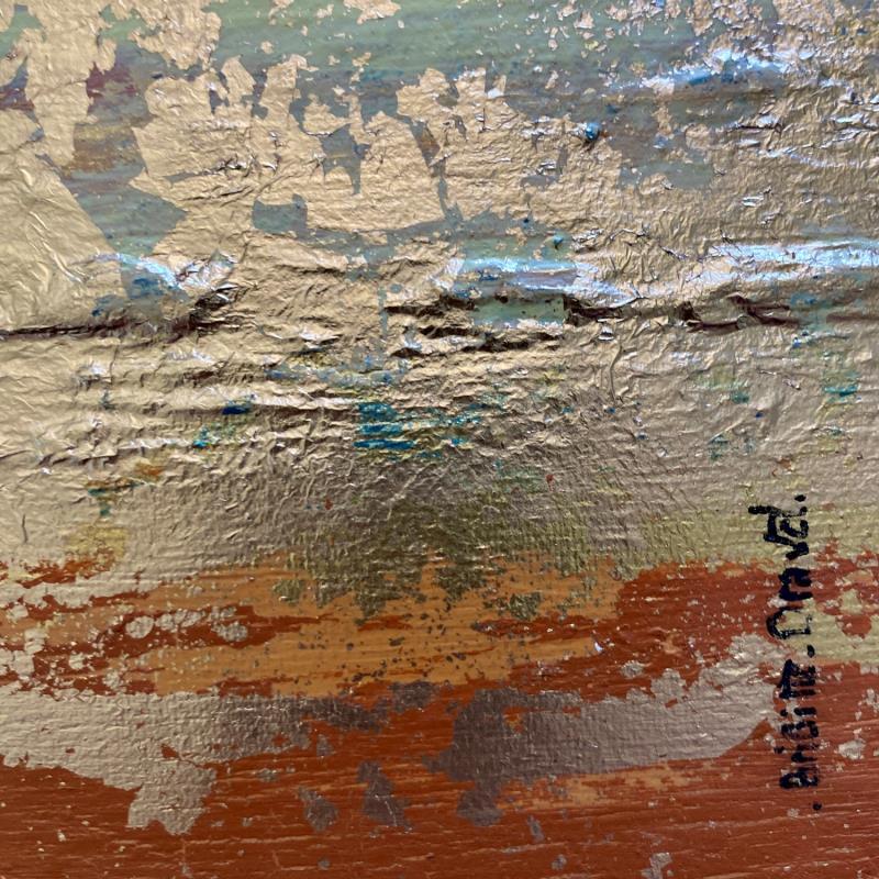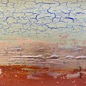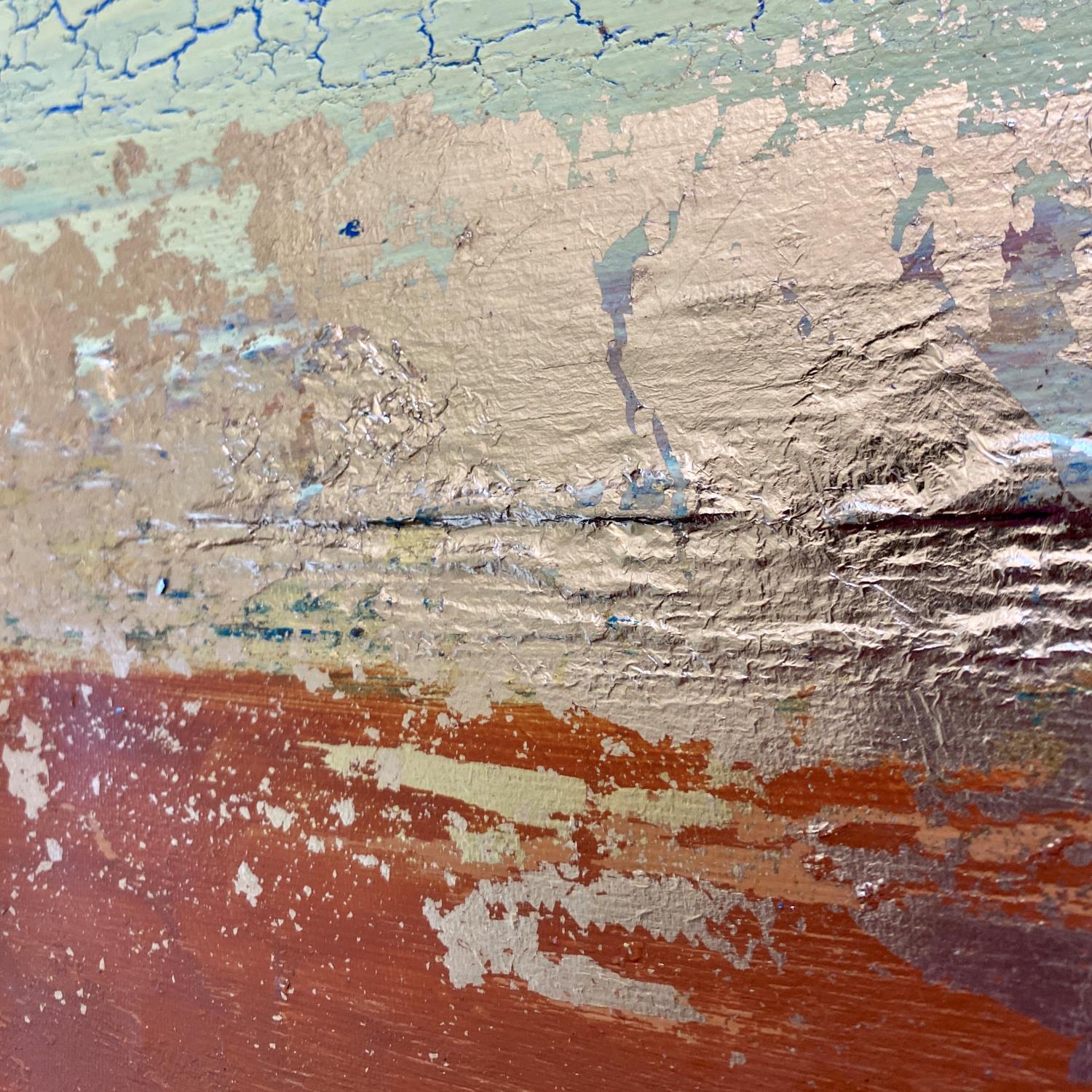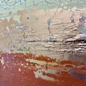 Travailleuse acharnée et passionnée, elle nous entraîne à travers ses mélanges de pigments dans un monde minéral et brut. Ses couleurs métalliques, dorées, cuivrées, rouillées, s’organisent dans un rendu fissuré, craquelé et accidenté, rempli de délicatesse, de poésie et de sérénité.