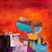 L'artiste a utilisé les techniques Acrylique, Collage, Feuille d'or, Papier, Pastel pour créer cette peinture petit format sur Carton de style Abstrait sur le thème Paysages.