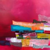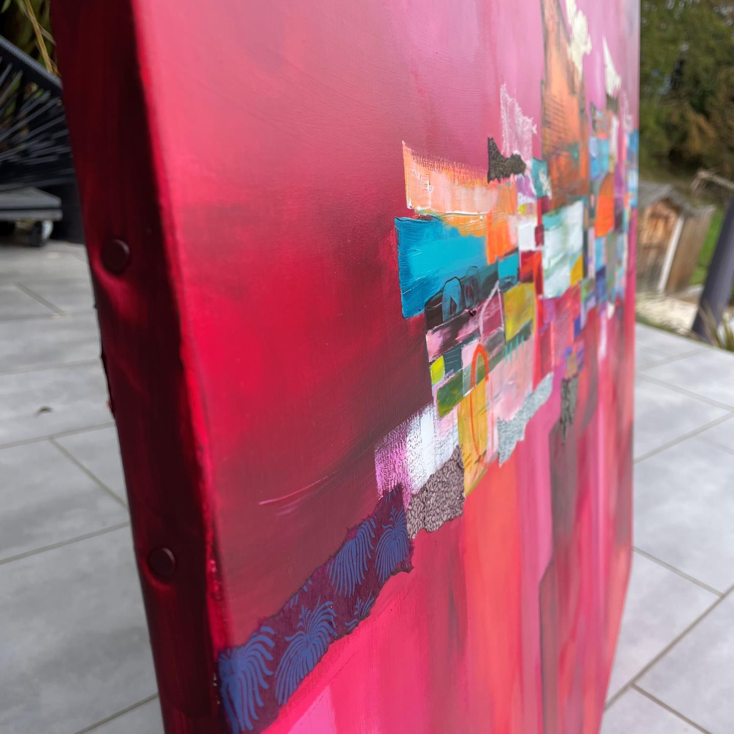 L'artiste a utilisé les techniques Acrylique, Collage, Feuille d'or, Pastel pour créer cette peinture grand format sur Toile de style Abstrait sur le thème Paysages.